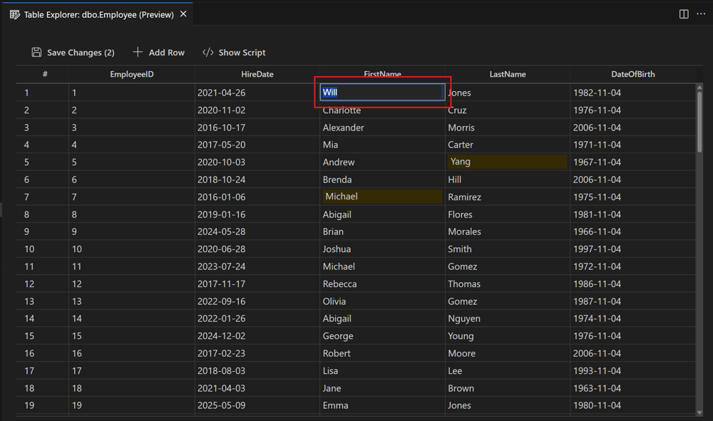视图和编辑数据(预览版)提供了一种直观的交互式方式,可在编辑器中直接浏览和修改表数据,而无需编写 Transact-SQL 数据作语言 (DML) 语句。 开发人员可以在直观的界面中与其数据进行交互,从而简化从快速编辑到深入验证的所有内容。