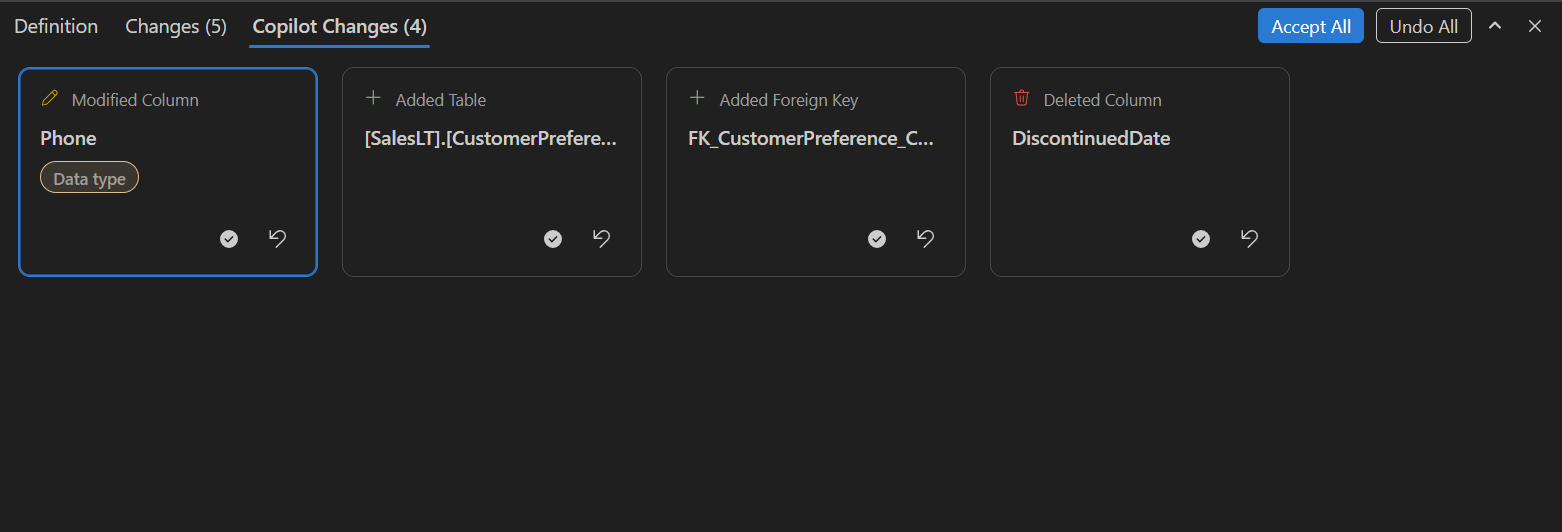 - 应查看 AI 生成的输出:GitHub Copilot 可能会建议不正确的或欠佳的架构建议。 在发布到数据库之前,请始终查看生成的 SQL 和架构更改。