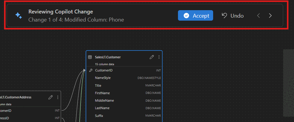 在通过 GitHub Copilot 或界面进行架构编辑后,请在将这些更改应用到数据库之前仔细审核所有未决更改。