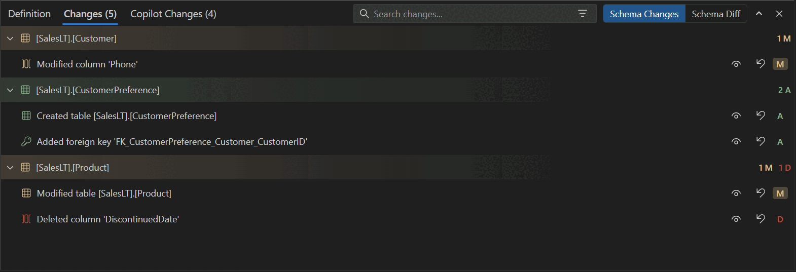 schema.table和schema.column。 - 将鼠标悬停在单个更改上时显示的 “撤消 ”选项。