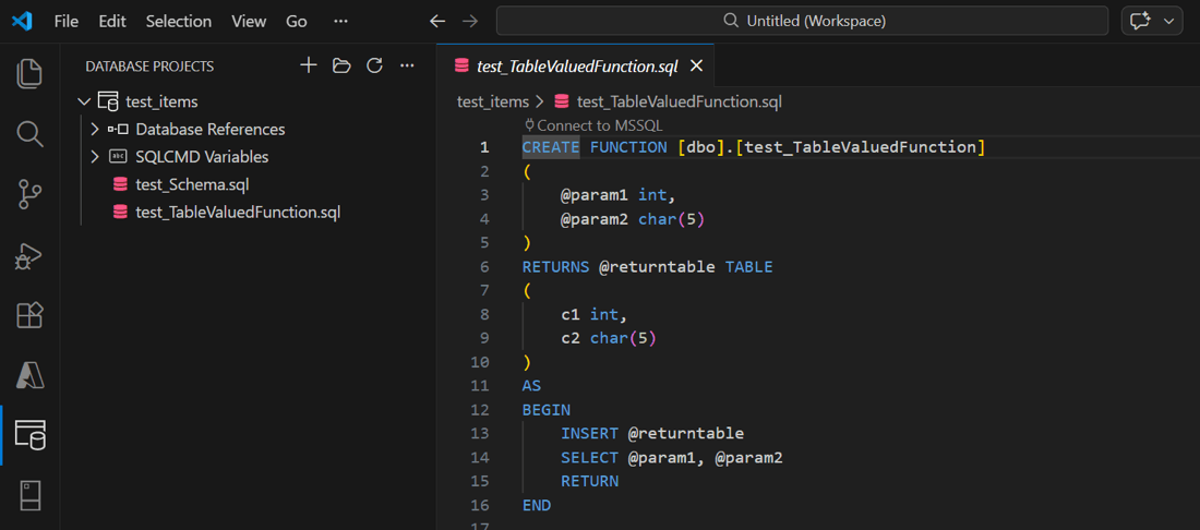 使用用于Visual Studio Code的 SQL 数据库项目扩展,使用项模板将通用数据库对象添加到项目中。 项模板使用标准样本代码生成格式正确的Transact-SQL (T-SQL) 文件,从而帮助你保持数据库架构的一致性。