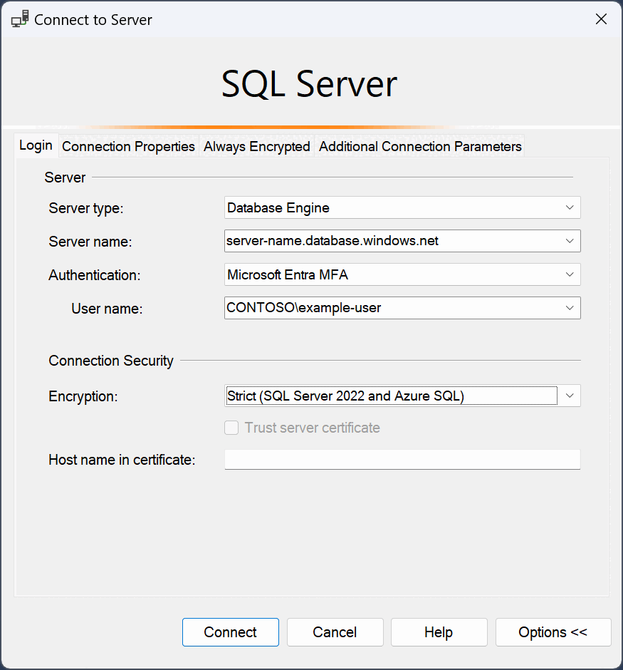 使用托管标识连接到 SSMS 需要 Azure VM。 请参阅 使用 Windows VM 系统分配的托管标识访问 Azure SQL-违约 使用无密码和非交互的任何Microsoft Entra 身份验证模式进行连接时,可以使用默认选项。 SQL Server 身份验证 使用SQL Server 身份验证连接至 Azure SQL。 登录 服务器帐户用户 ID 用于创建服务器的服务器帐户中的用户 ID。 密码 服务器帐户密码 用于创建服务器的服务器帐户的密码。 数据库名称 提供 Azure SQL 数据库的数据库名称。 加密2 加密方法 选择连接的加密级别。 默认值为 必需。 信任服务器证书 信任服务器证书 选中此选项可绕过服务器证书验证。 默认值为 False (未选中),它使用受信任的证书提升更好的安全性。 证书中的主机名 服务器的主机名 此选项中提供的值用于在服务器证书中指定与预期不同但仍符合期望的 CN 或 SAN。 1 Azure SQL 不支持 Windows 身份验证方法。 有关详细信息,请参阅 Azure SQL 身份验证。 建议将微软Entra身份验证与多重身份验证(MFA)一起使用。