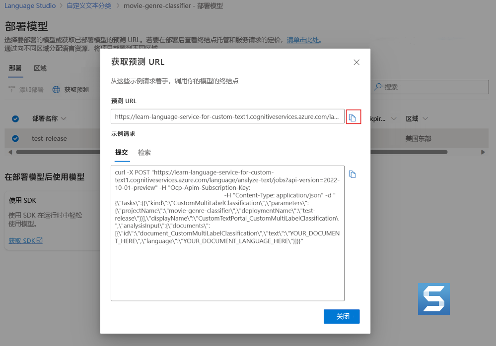 - 已训练的自定义文本分类部署模型的终结点。