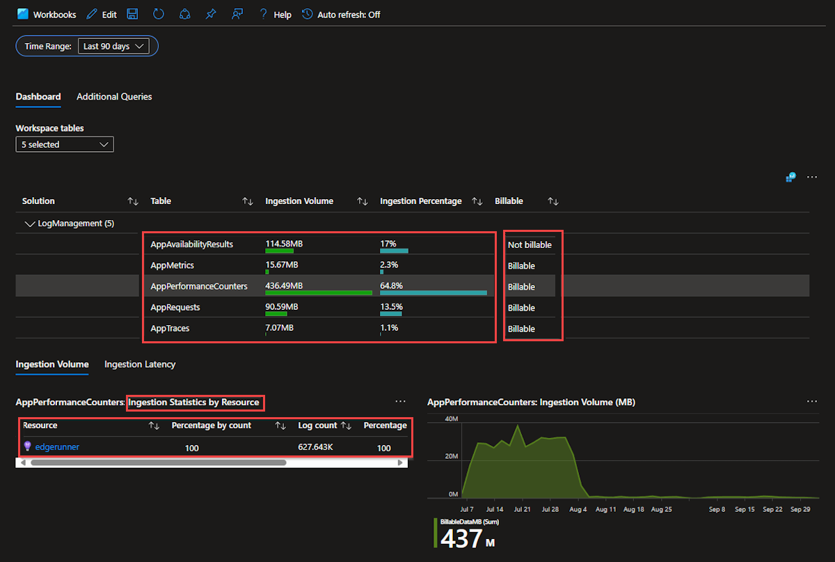 此工作簿提供有价值的见解,例如每个表的数据摄取百分比,以及同一工作区下每个资源的详细数据摄取统计信息。