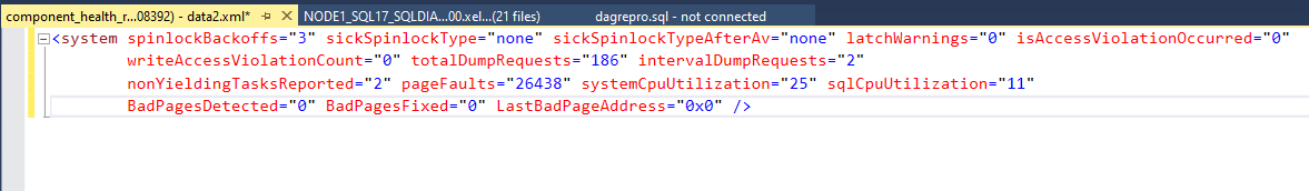 请注意,“totalDumprequests=186”数据指示此 SQL Server 上生成的转储文件诊断事件过多。 这是系统组件报告错误状态的原因。 当 AlwaysOn 运行状况监视收到此错误状态时,它会触发可用性组运行状况事件。 还可以验证是否未从系统组件数据中提供的数据检测到写入访问冲突或孤立旋转锁。