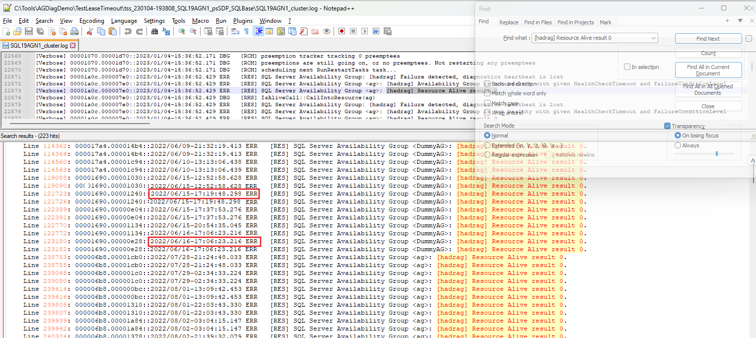 可以使用工具查找群集日志中的所有运行状况事件,以便生成 AlwaysOn 运行状况问题的摘要报告。 这可用于识别时间顺序趋势,并确定特定的 AlwaysOn 运行状况状况是否定期出现。 以下屏幕截图显示了如何使用文本编辑器(在本例中为 NotePad++)查找包含字符串的群集日志 [hadrag] Resource Alive result 0 中的所有行: