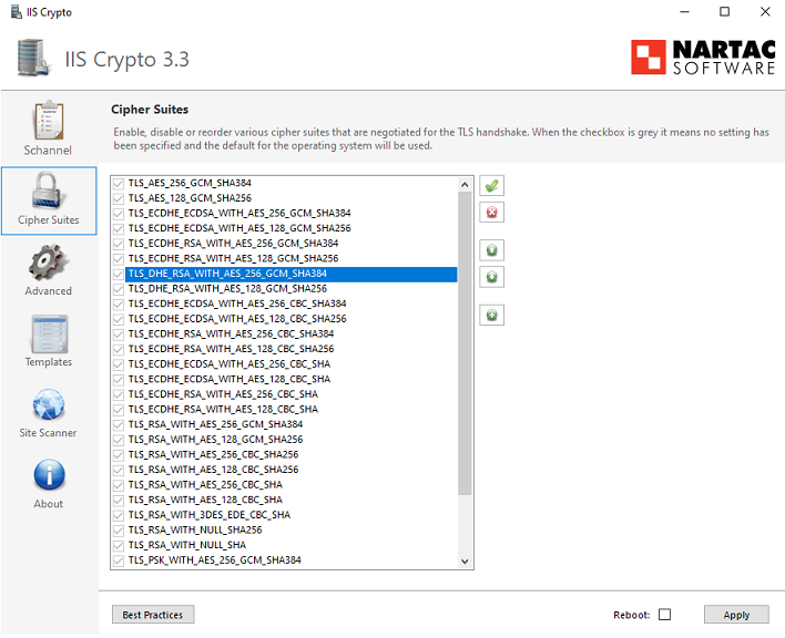 在 IIS 加密接口中,选择 左侧面板中的密码套件 。