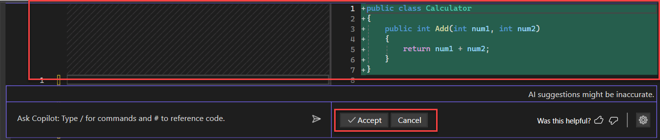 你将在 Visual Studio diff 视图中看到 Copilot Chat 中的代码建议。 选择“接受”可查看和优化提议的内容并应用于代码,而选择“取消”可放弃这些内容。