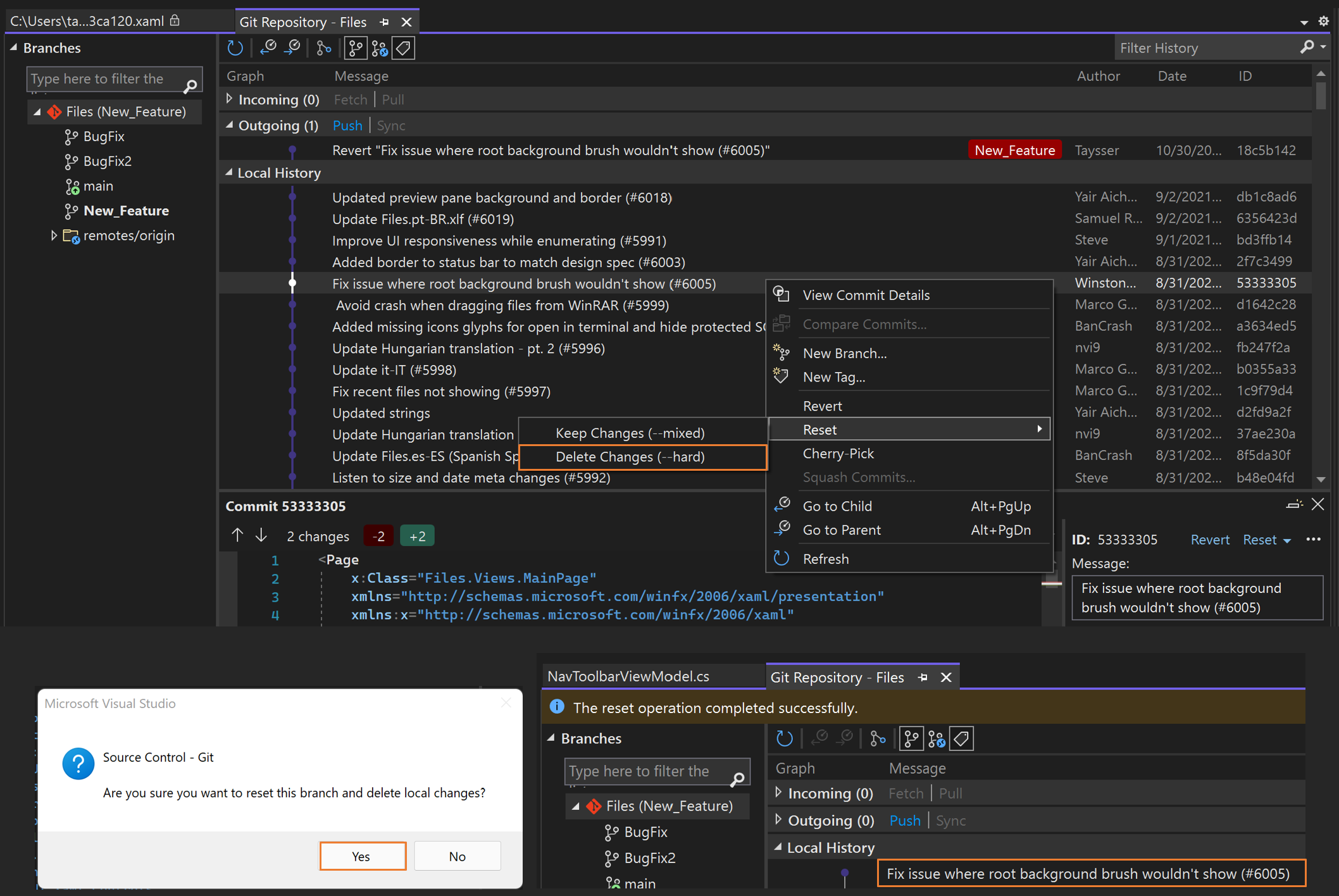 命令 --hard 部分告知 Git 将文件重置为上一提交的状态,并放弃任何暂存更改。 若要在 Visual Studio 中执行相同操作,请右键单击要重置分支的提交,然后选择“重置”“删除更改(--hard)”>。