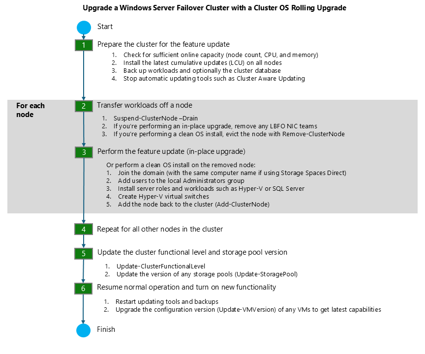 - 在最后一步之前,当所有群集节点都运行较新版本的 Windows Server 并更新群集功能级别时,升级过程是可逆的。