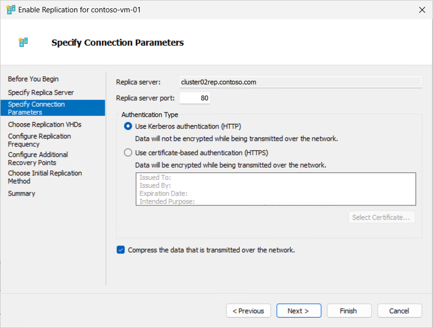 查看副本服务器设置。 如果使用基于证书的身份验证,请选择 “选择证书”,系统会提示为符合要求的主主机选择证书。 如果要压缩通过网络传输的数据,请选中此框。 选择“下一步”。